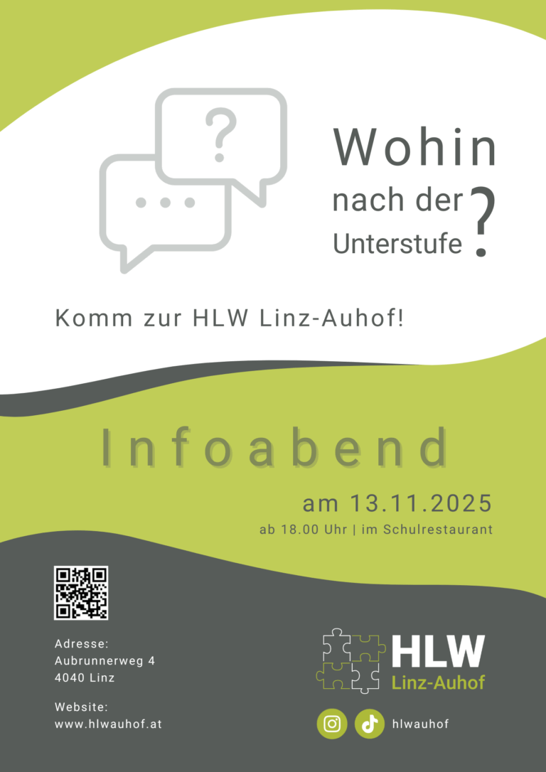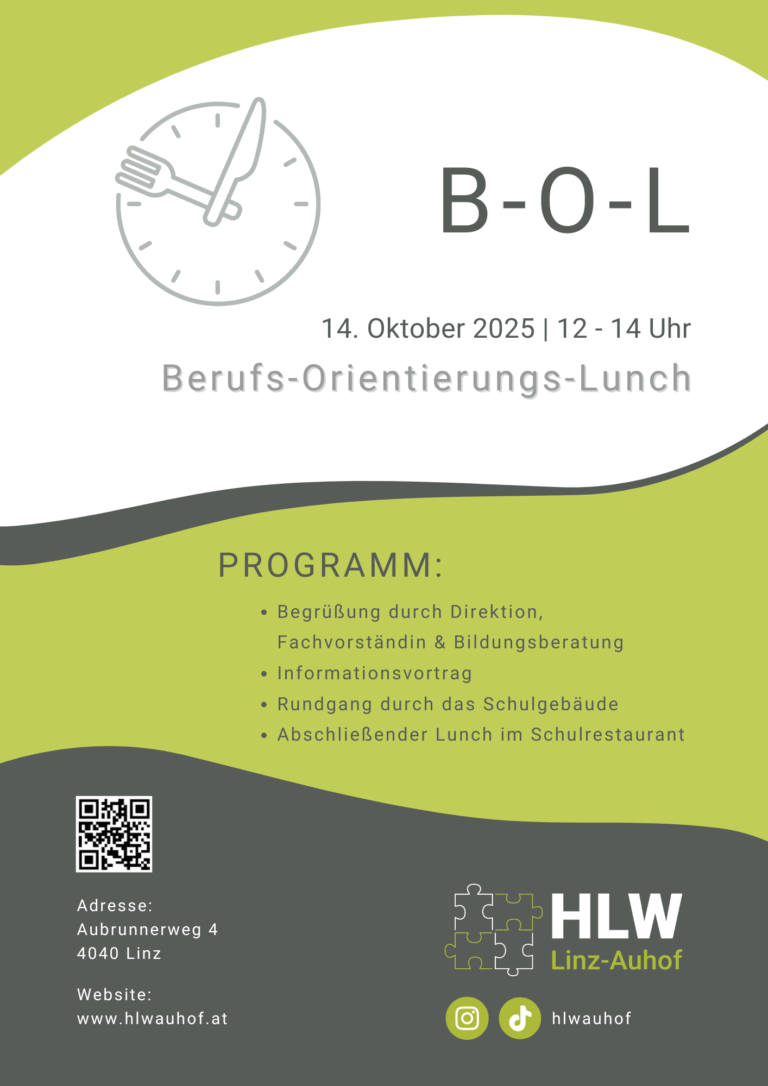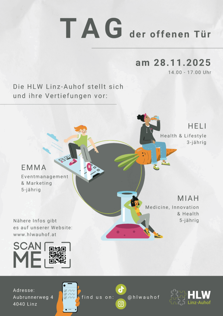 HLW Linz Auhof 2025-26 Beitrags-Autor:bo.fesl.co.at Beitrag veröffentlicht:25. September 2025 Beitrags-Kategorie:Schnuppertermine / Tage der offenen Tür Beitrags-Kommentare:0 Kommentare HLW Linz-Auhof» Management und Gestaltung von Dienstleistungen (5-jährig)» Lebensmittel & Ernährung (5-jährig)» Gesundheit & Soziales (3-jährig)Informationsabend: 13.11.2025 (ab 18:00 im Schulrestaurant)Tag der offenen Tür: 28.11.2025 ( 14:00-17:00)» InfofolderAnmeldung Schnuppern 4040 Linz, Aubrunnerweg 4Telefon: 0732 / 75 09 03 / Fax: 0732 / 75 09 03 – 50mail: S401569@bildung.gv.atweb: hlwauhof.at Das könnte dir auch gefallen 22. & 23.11.2019 Tag der offenen Tür Technische Fachschule Haslach 18. September 2019 HBLA Lentia 2024/25 13. November 2024 PTS Rohrbach Schnuppertermin 18.01.2019 (12.30-15.30) 5. Dezember 2018 Schreibe einen Kommentar Antworten abbrechenKommentierenGib deinen Namen oder Benutzernamen zum Kommentieren ein Gib deine E-Mail-Adresse zum Kommentieren ein Gib deine Website-URL ein (optional) Δ
